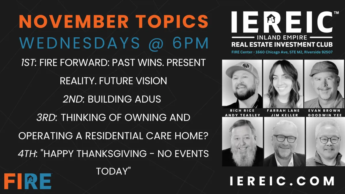 There's no need to spend tens of thousands of dollars on "gurus" who promise the world. You just need a good group of people that want to better themselves and the people around them. Come to one of our real estate events in Riverside (or Zoom), and see what our community of investors can do for you!
